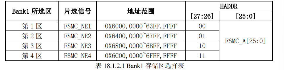 - 当 Bank1 接的是 16 位宽度存储器的时候:HADDR[25:1]→ FSMC_A[24:0]。