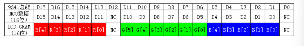 - ILI9341的18根数据线与MPU的16为数据线,以及GRAM的对饮关系