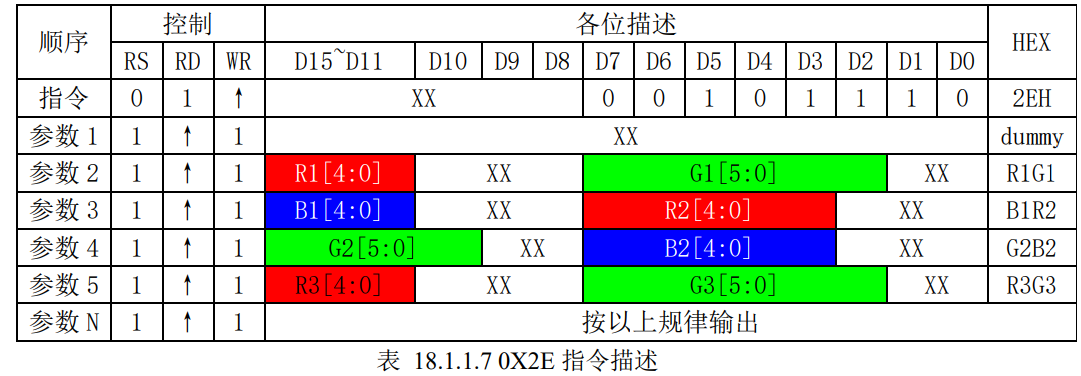 - 每个颜色分量占 8 个位,一次输出 2 个颜色分量。比如:第一次 输出是 R1G1,随后的规律为:B1R2→G2B2→R3G3→B3R4→G4B4→R5G5… 以此类推。如果 我们只需要读取一个点的颜色值,那么只需要接收到参数 3 即可,如果要连续读取(利用 GRAM 地址自增,方法同上),那么就按照上述规律去接收颜色数据。