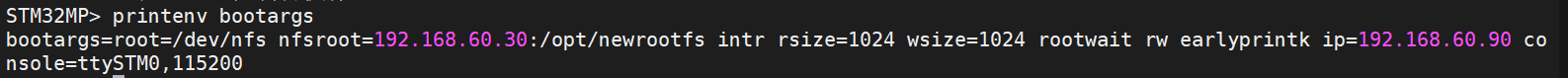 setenv bootargs 'root=/dev/nfs nfsroot=192.168.60.30:/opt/newrootfs intr rsize=1024 wsize=1024 rootwait rw earlyprintk ip=192.168.60.90 console=ttySTM0,115200'