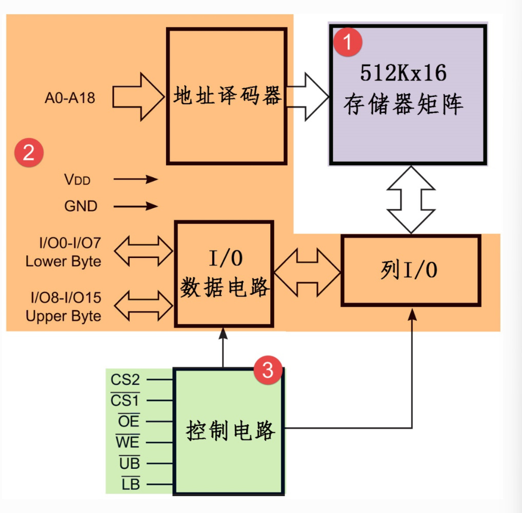 框图中标记号表示存储矩阵,这个SRAM芯片的内部空间大小为512*16(bits),即1M字节容量16位宽的静态内存芯片。