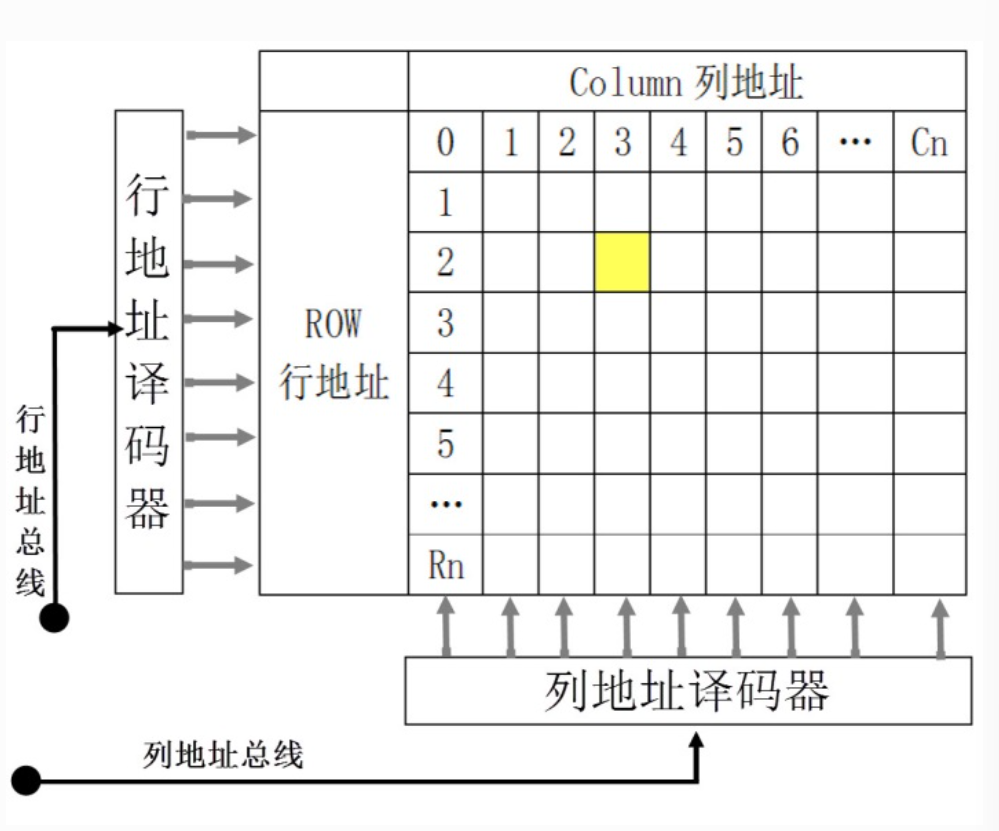 地址编译器把N条地址线转换为2N根信号线,每根地址线对应着一列或着一行存储单元,通过地址线找到具体的存储单元。如果存储矩阵比较大,地址会分为列地址线、行地址线,或者行、列地址线会复用一条地址线,访问数据寻址时会先用地址线传输行地址再传输列地址。