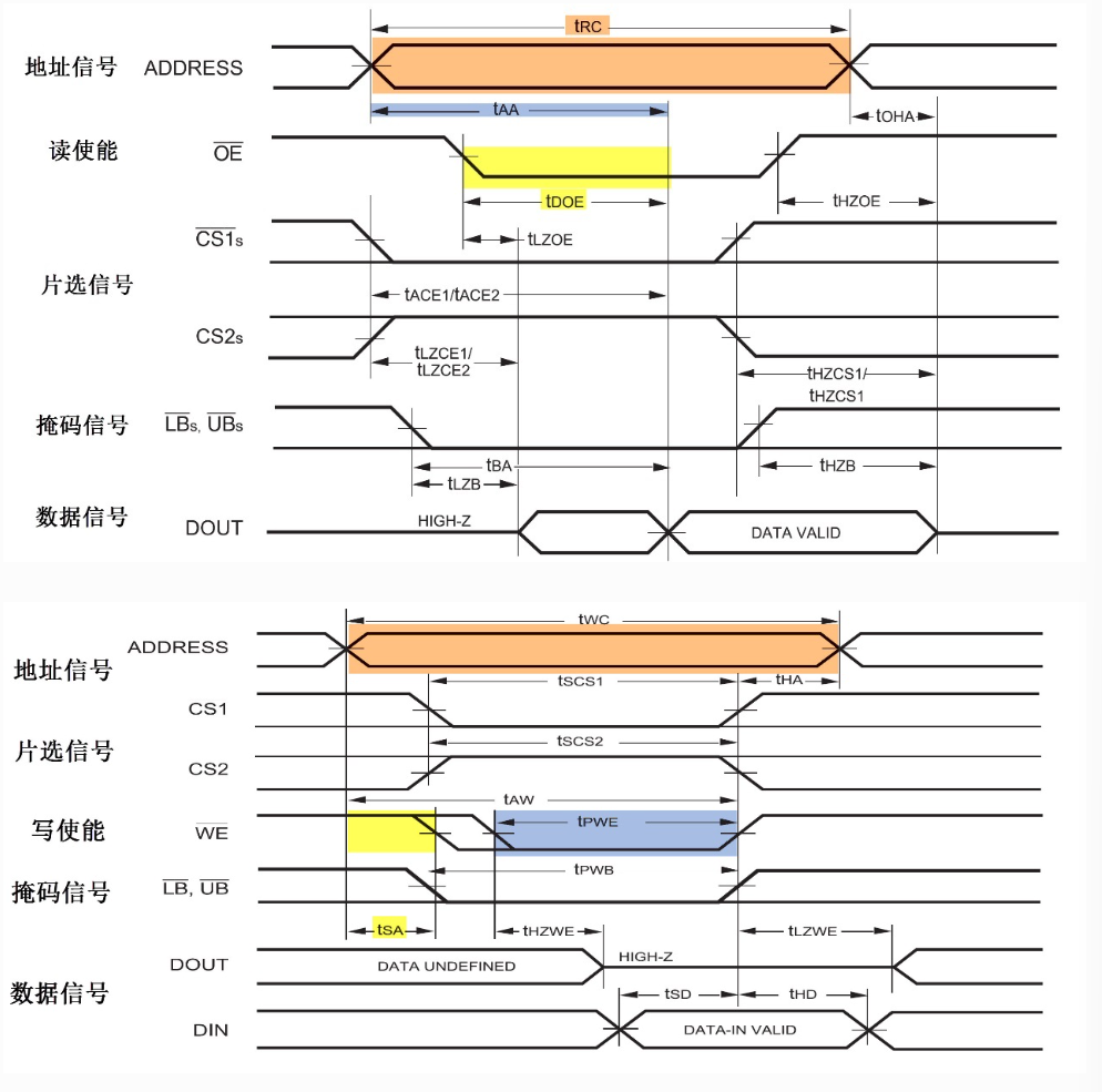 对SRAM进行读写数据时,它各个信号线的时序流程图如图。