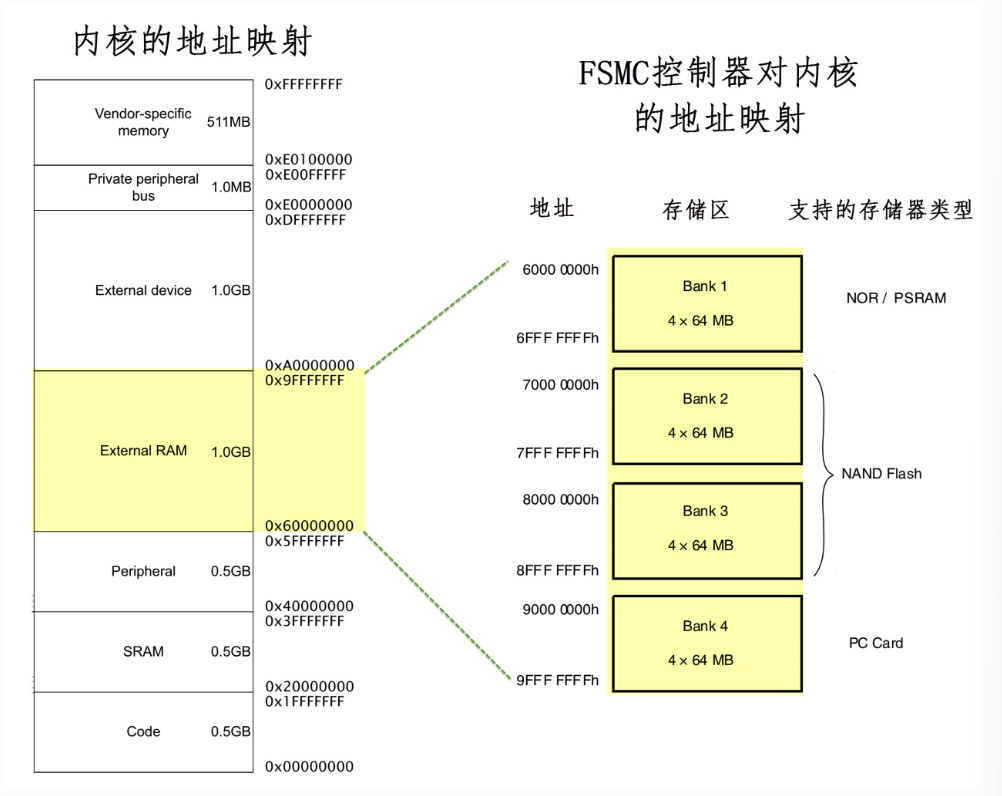 图中左侧的是Cortex-M4内核的存储空间分配,右侧是STM32 FSMC外设的地址映射。 可以看到FSMC的NOR/PSRAM/SRAM/NAND FLASH以及PC卡的地址都在ExternalRAM地址空间内。 正是因为存在这样的地址映射,使得访问FSMC控制的存储器时,就跟访问STM32的片上外设寄存器一样(片上外设的地址映射即图中左侧的“Peripheral”区域)。