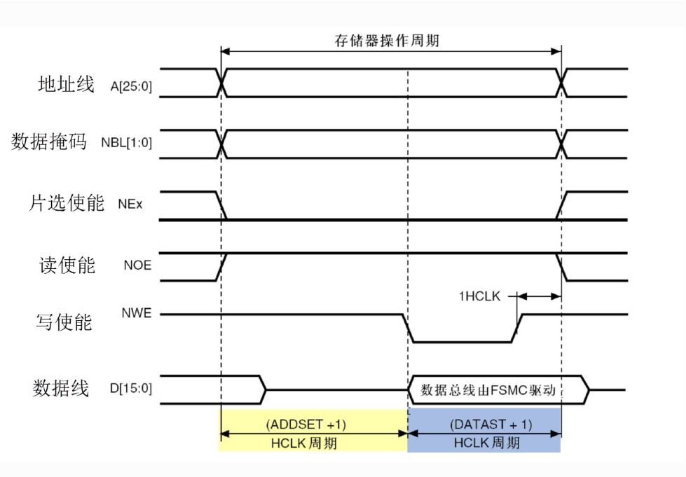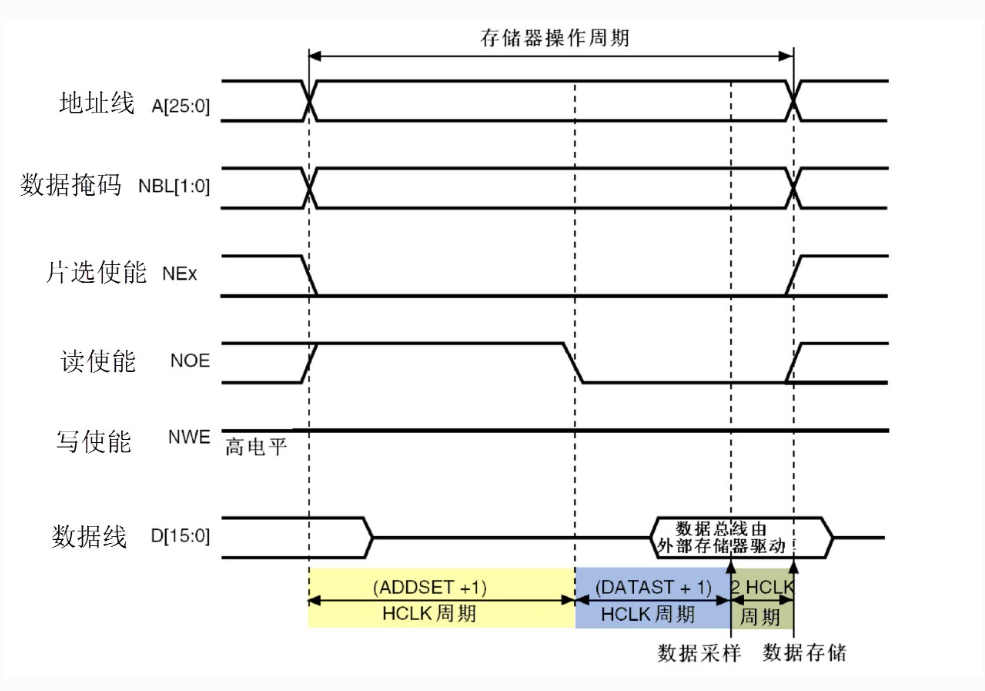 以读时序为例,该图表示一个存储器操作周期由地址建立周期(ADDSET)、数据建立周期(DATAST)以及2个HCLK周期组成。